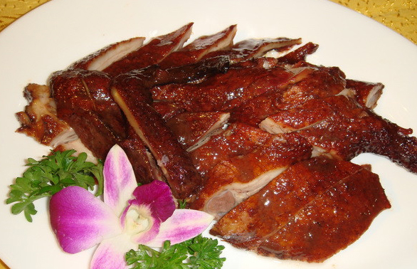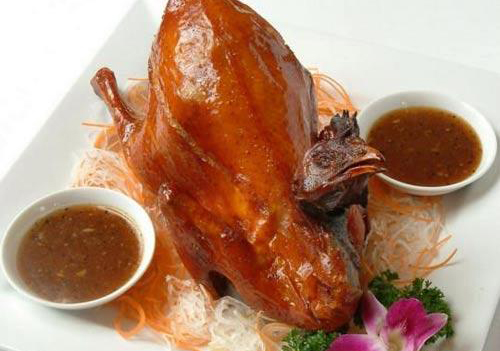 醬雞是一道烏鎮(zhèn)的漢族特色名菜,外觀醬紅油亮,入口脆嫩鮮美,后味無盡。選用本地農(nóng)民當(dāng)年放養(yǎng)的土種雌雞作原料。加工時(shí)整體燒制,原汁浸燒,三次出湯;再放入上等醬油、黃酒、白糖和香料等佐料浸燒 ;出鍋后又得涂上一層麻油 ,方告完成。成品醬雞由于是原汁原湯反復(fù)燒制,雞體內(nèi)的水分已基本蒸發(fā),所以特別容易保存,有"六月不餿,臘月不凍"之說。